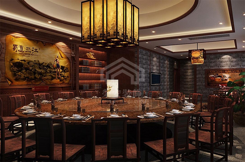 川菜馆设计装修材质的运用上以原木色实木为主,底色为传统的青砖色,这样的户型,首先我们可以注意一下沙发是否能换一个位置来摆放,把这一侧的改造空间留出来。其次是可以通过新砌墙体和柜子的方式,新建造出一个功能区域,完善整个空间。再衬以器物的细致安放,结合造型使整个川菜馆设计装修空间充满静谧而意境悠远的中式韵味。